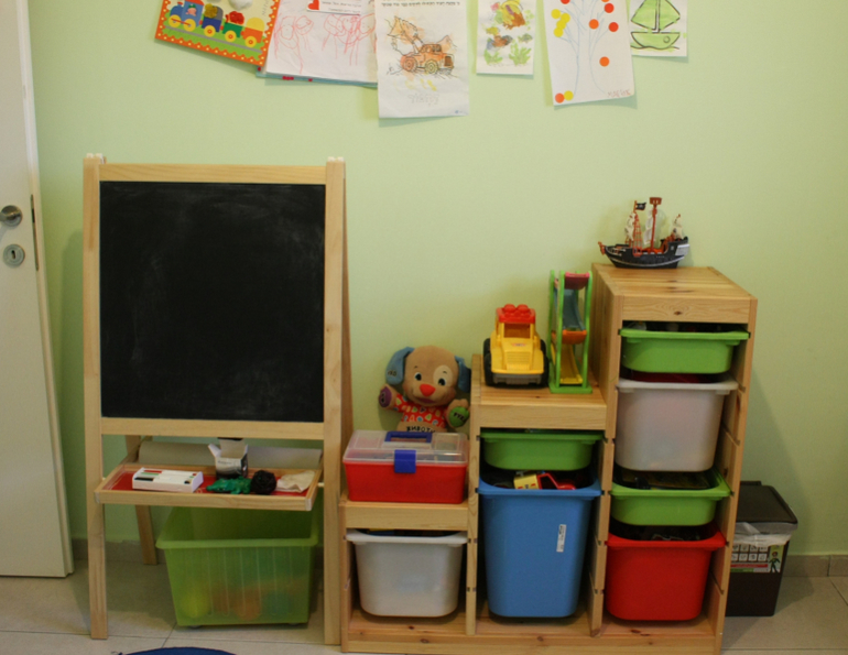 Основное Хранилище игрушек - очень удобный Труфаст, привезенный (как и столик) еще с предыдущей квартиры. Есть ящик для деревянной железной дороги, ящик для транспорта, ящик для мячей и шариков и, конечно, ящики для всякой всячины. Над Труфастом и доской для рисования - сменная экспозиция на леске и маленьких металлических прищепках для штор.