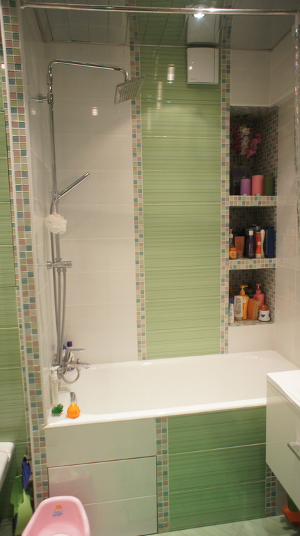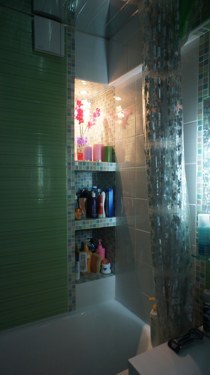 Ванну мы поставили по стене,где обычно стоит раковина,а раковину на место ванны. Когда ломали сантехкабинку,за ней обнаружилась такая ниша,в которую мы встроили полочки,а над ними подсветку.