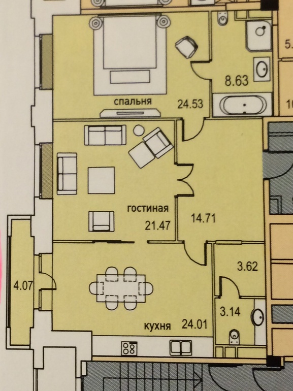 О, у моей подруги такая планировка. Они тоже выкраивали. Перенесли кухню в холл. Получилась проходная кухня и проходная гостиная. Скажу честно не очень. Но у них была такая необходимость.