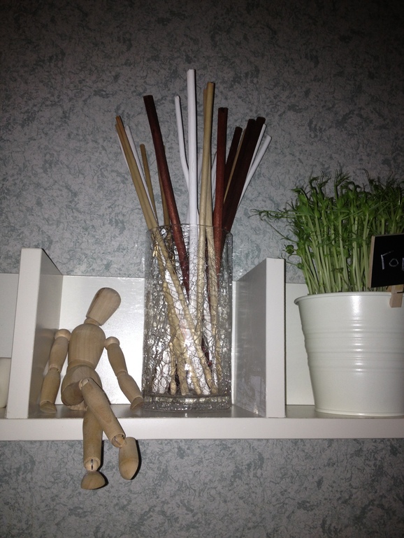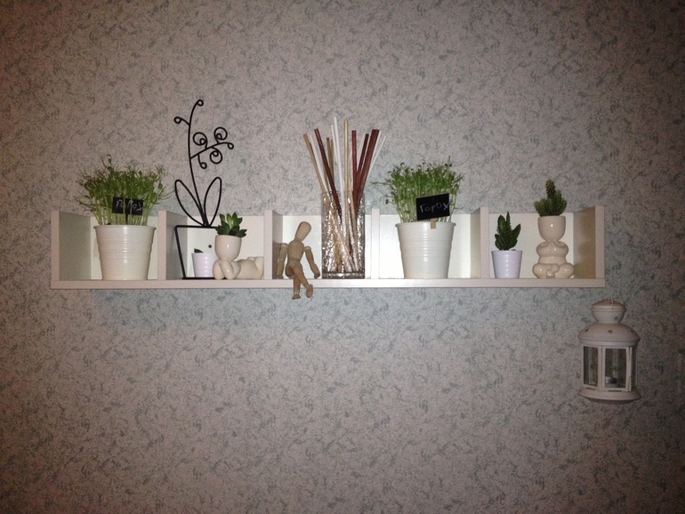 Тут сплошная Икея (всё, кроме вазы и керамических человечков). Кстати, проростки — не только для красоты. Каждый день срезаю ростки и кладу в салат, а на их место ставлю новые горшки с проростками). Фонарь тоже зажигаю по вечерам.