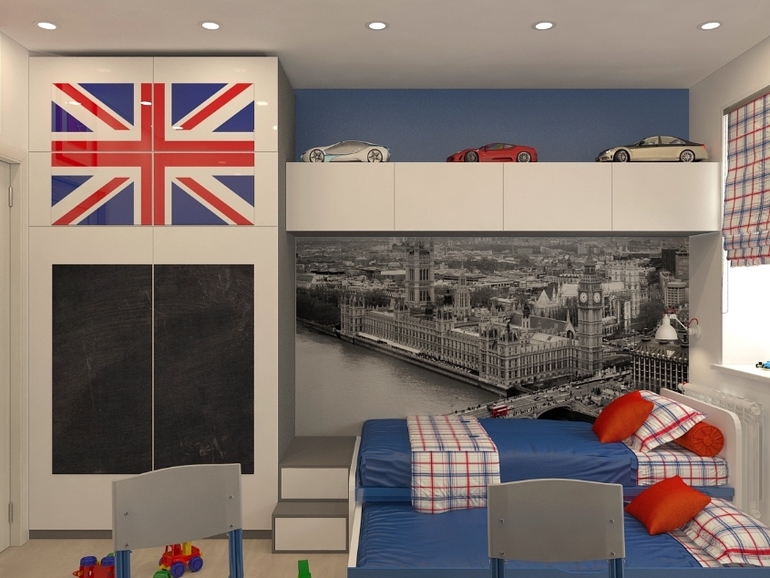 (может кому то покажется комната не слишком яркой и не слишком детской, но этот стиль (Британия) выбирал старший сын, я ему предлагала динозавров, Тачки, но с недавних пор он просто "заболел" Британией, британскими флагами - кроссовки, кепки, джинсы - все с этой символикой.
