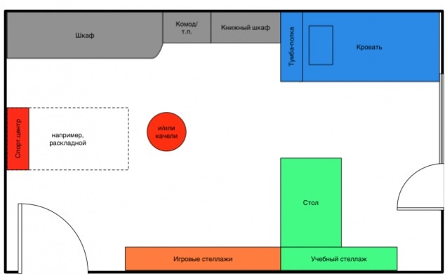 Вот набросала что-то. Прошу прощения за мебель, в программе больше ничего нет ) Смысл в том, что можно отгородить спальную, рабочую и игровую зоны, сделать это можно с помощью стеллажей, в икее вроде видела интересные. Кровать я бы не стала ставить возле окна, там хорошо разместится стол вдоль стены. Как у Вас стол стоит, в этом случае может свет из окна прямо в монитор падать. В игровой зоне можно коврик постелить, ребенку будет мягко играться ) За дверью поставить комод низкий, на него телевизор, либо высокий комод с фотографиями или на стену картинки повесить, часы, вариантов много. Удачи в ремонте! )fd4dfb8ce734c32829fffed7618989c1.png 1e0adb9a76bf427da46c139026ff4357.png 63f8eea7cecf5903de64ff6ac4f38e9a.png f82b5adfefd4c1bec8a6f5f9523d9adf.png