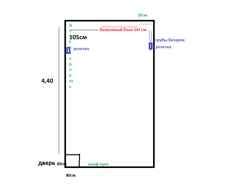 Ну и как смогла схематически изобразила комнату. Пометила куда думаю шкаф купе и детскую кровать.