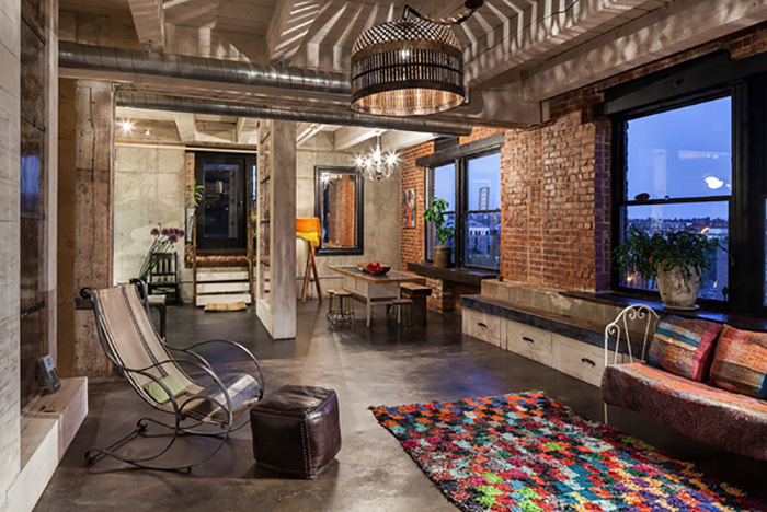В итоге в лофте смешалось все, что только можно вообразить: потолки и индустриальные стены, краска и красная венецианская штукатурка, мешковина вместо обоев в гостиной, стол ручной работы, окна из старого сарая, марокканская лампа, японская традиционная ванна из кедра - уф, всего и не перечислить! Это эклектичное сумасшествие можно рассматривать часами: гадать, из какого выполнено то или иное дизайнерское решение, как здесь оказался каждый из предметов, а главное - как же так получается, что при этом пространство выглядит так гармонично?