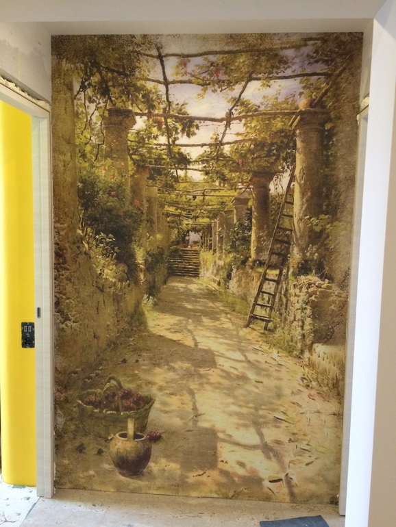 А фреску хотелось "с перспективой", она ровно напротив входной двери (через весь коридор) и хотелось дольше увести пространство, в каталоге выбрали эту. И на кухне подобрали к ней в тему винограда
