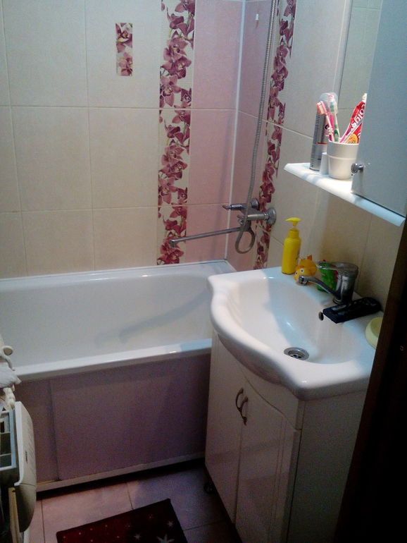 У родителей маленькая ванная, на полу плитка ярко оранжевая,на стенах белая и две полосы белой с оранжевым декором. Я эту ванную просто обожаю! Себе тоже хочу оранжевую.