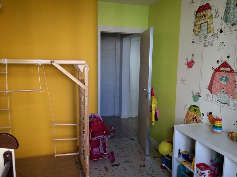 У нас дочке 2,2 скоро будет вторая, о чем мы не знали и не планировали делая ремонт, возможно отдали бы им бОльшую комнату. Тут всего 9кв м. Сразу скажу, все вещи хранятся в гардеробной, тк у нас всего один шкаф и гардеробная.