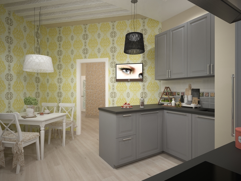 часть кухни на фото ниже (обои только в обеденной зоне, остальные стены под покраску