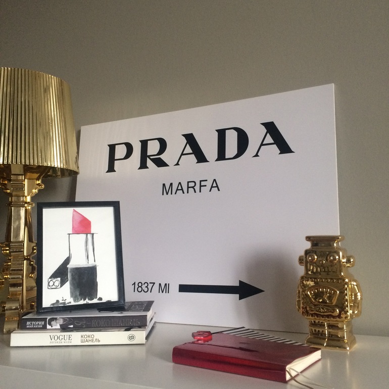 Интерьерные штучки.Постер Prada Marfa - узнают почитательницы модных кинолент и стильных апартаментов. Эта лаконичная надпись-знак впервые появилась в сериале «Сплетница» и с тех пор украшает интерьеры самых стильных леди планеты. Постер указывает расстояние до бутика знаменитого дома моды, который расположен по среди пустыни в Марфе. Этот оригинальный "памятник" fashion-индустрии (ведь магазин на самом деле не работает) стремятся посетить модницы всего мира. А сам постер-указатель вошел в список самых оригинальных творений современного искусства!