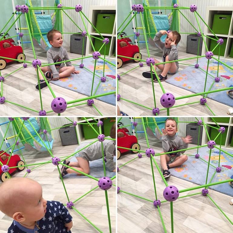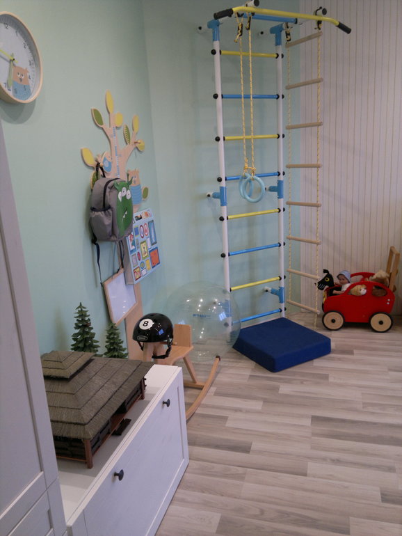 При входе слева: шкаф и скамья с ящиком IKEA. ДСК Маугли, синий мат по совместительству батут