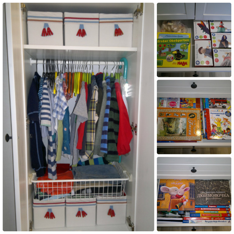 Что мы храним в шкафу. Конечно я не планировала его для книг и игрушек, но нужный стеллаж сняли с производства. Идеи, как более грамотно распланировать хранение, есть, но пока не решила.