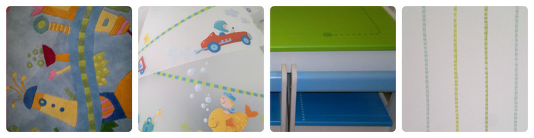 Комната имеет 5 стен. Обои бумажные, французской фирмы CASADECO, серии happy world. 2 стены-однотонные, 2 - в полоску и одна, за кроватью, с рисунком.