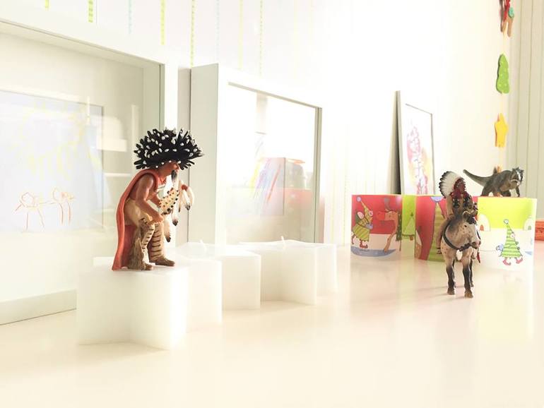 Изначально хотела длинную белую полку IKEA над стеллажом, но т.к. стену утеплили, не могу этого сделать, поэтому в ближайшем будущем ее украсят рамки с рисунками малышей). Экспозиции на стеллаже периодически меняем.