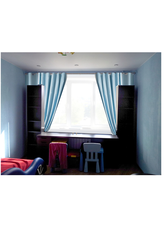 Я бы эти шкафчики подняла до потолка и прибила бы до стены. Отпилила вровень со столешницей. На стол заказала бы новую светлую столешницу от стенки до стенки. А под столешницей по бокам коробки красивые для игрушек поставила. Убрала бы карниз (следы от крепления шкафы перекроют) и повесила короткую рол штору или римку. Полки и заднюю стенку можно обклеить самоклейкой белой в тон новой столешницы.