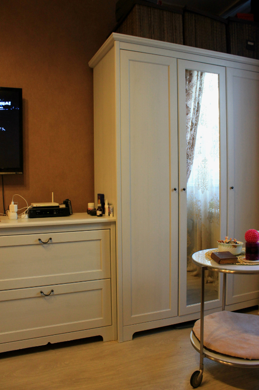 Привет! Мы живем в двушке. Особого деления пространство не имеет: большая комната для гостей и для нашего сна. В маленькой днем в коляске спит годовалый сын. Детские игрушки и мамские гаджеты, облегчающие жизнь с ребенком, повсюду. Вот, собственно, наша маленькая комната: