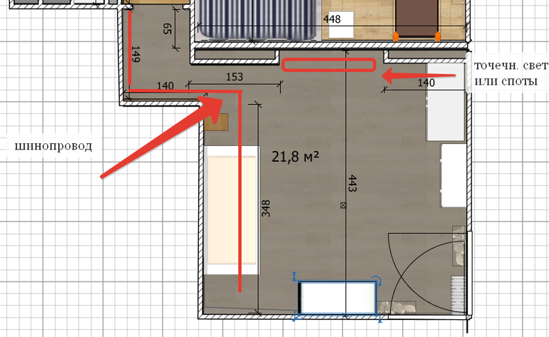 Вопрос: стоит ли делать шинопровод как на картинке отмечено? Отступила от стены на случай перестановки в будущем. Или делать выводы под светильники - споты на 2-3 светильника (как на фото 2,3)? где лучше их разместить? В нише лучше точечный свет в г/к коробе или одиночные споты прикрутить вдоль стены к потолку (последнее фото)?