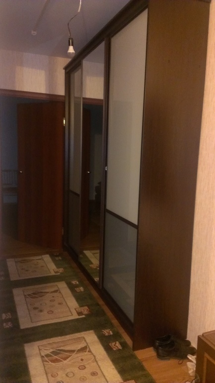 Интерьерное решение прихожих, коридорчиковКупили шкаф-купе цвет корпуса венге длиной 2200,по краям 2 стеклянные двери сверху светло серые снизу темно серые а средняя дверь зеркало. И когда поставили его на место, прихожая стала совсем тёмная