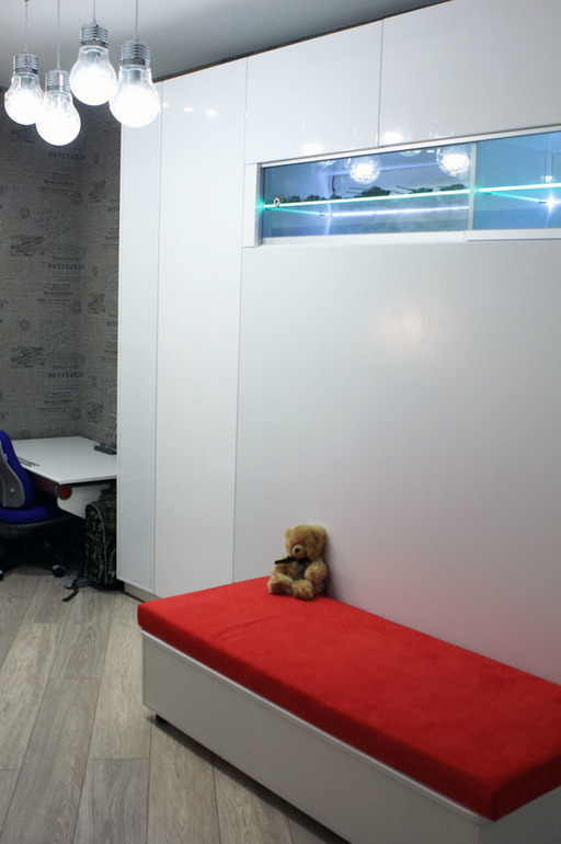 За красным диваном - большая белая маркерная доска (2000х120). Красили мы с мужем, сами. Сошло 7 потов :))) Ну и, конечно, "гениальный дизайнер с бредовыми идеями" был послан неимоверное количество раз, за эти самые бредовые идеи, но в конечном итоге все остались довольны :) Теперь будем формулы на доске рисовать :)