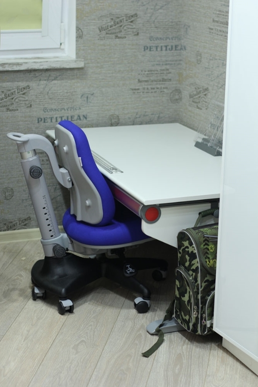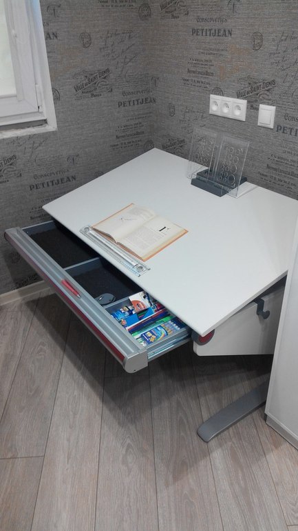 Растущие стул и стол. Дитя может спокойно расти до 2-х метров, стол не будет отставать :) Так же меняет угол наклона. Под столешницей пенал и вместительный ящик.