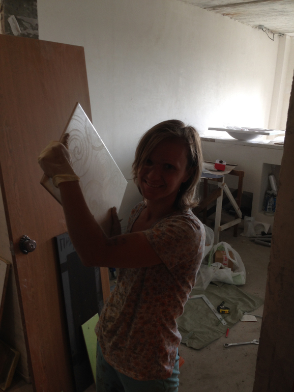 А потом мы поняли, что стены то мы не подготовили, а там на пол стены побелка. На побелку, как известно плитка не ляжет и принялись шкурить стену)
