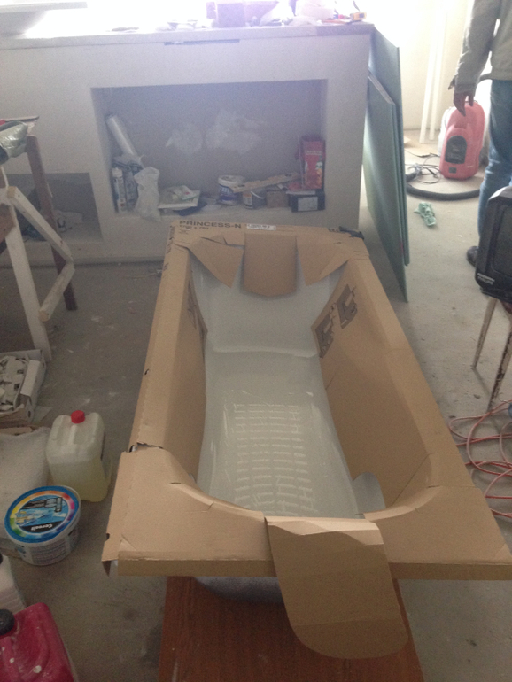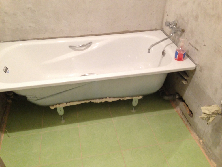 Установка ванны. Слава богу что купили не чугунную))) Эта оказалась намного тяжелее, чем от застройщика.
