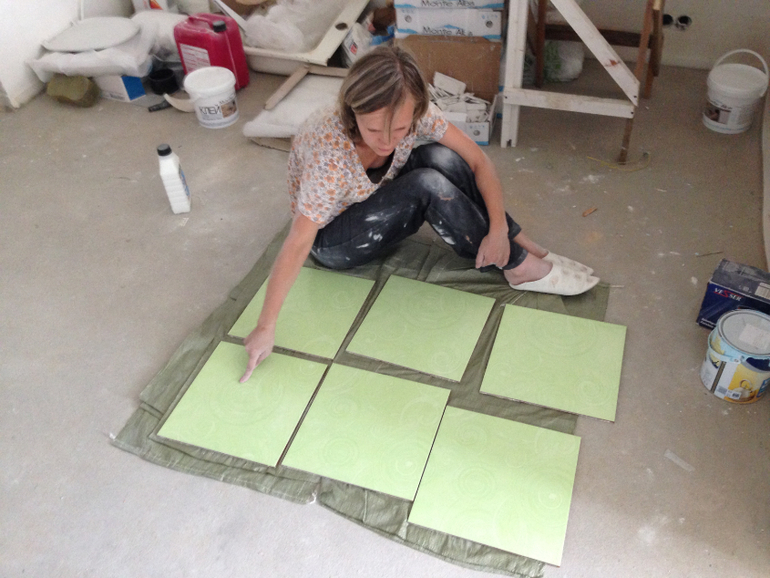 Начали с пола, т.к. потом предстояло на пол ставить ванну и уже потом на стены плитку укладывать. Плитку купили фирмы Азори серия Фьюжн. Честно плитка не ах. Но выбора у нас особо не было. Что нравилось было слишком дорого или не было в наличии. Я писала о том, какую хотела плитку, не но вышло((( Вот тут разложила на полу и пыталась составить рисунок, но он вообще не совпадал(((