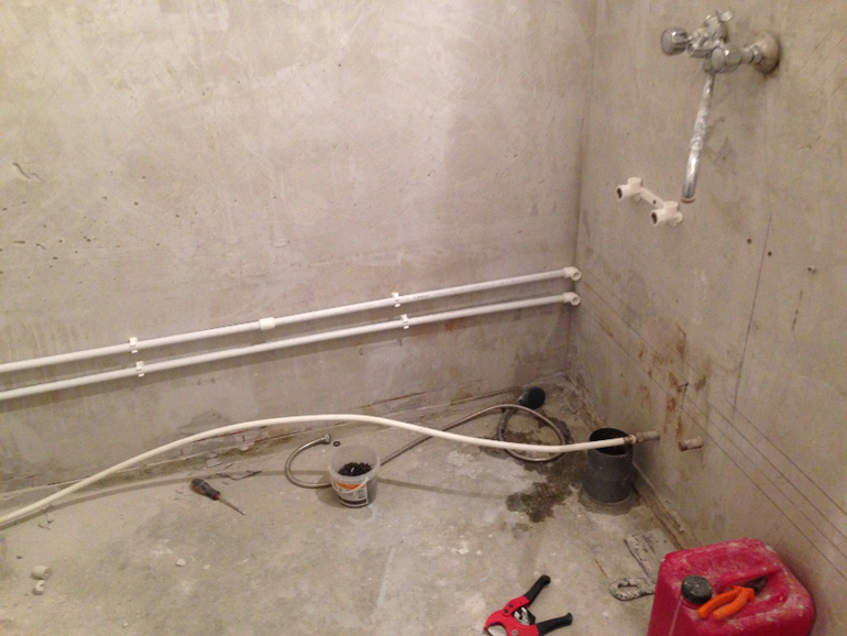 трубы решили спрятать в стене, пришлось тут ломать. Ох, там до бетонной стены оказалось почти 11 см. Вот ут мы подумали, зря не ломали, сколько полезной площади, даже если бы вновь возвели стены.