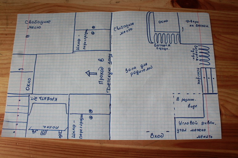 Здравствуйте всем! Перечитала почти все посты как живут семьи с детками в 1-к. квартире,но своей планировки так и не нашла.У нас квартира-недоразумение.Общ. площадью 32,7. Комната 13,рядом была кладовка( по документам),а по сути бывший подъезд с балконом площадью 5,2. Перегородку мы убрали и получили большую комнату 18,2 с 2 окнами и балконом.Но все расположить трудно.Мест для хранения нет,в коридоре просто вход,ТОЛЬКО вешалка вмещается и под уличную обувь.Решили разделить комнату вот так,ровно пополам,у окна сделать детскую зону для старшего сына(2 года),а сразу у входа родителям.Только вот мне скоро рожать и негде поставить кроватку для малыша второго.Посмотрите пожалуйста своим взглядом нормально ли так,что добавить,куда кроватку для малыша?Мебель останется эта,сразу все менять нет средств.Приобретем кроватку,стеллаж Икея старшему.Может еще что-то? Всем откликнувшимся заранее большое спасибо.