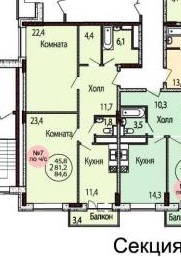 Мне нравится ваша задумка! Только я бы еще под кухню захватила кладовку 4,4, тк туда идет свет от окна в углу, да и к тому же до коммуникаций меньшее расстояние. А кладовку сделала бы по нижней стене комнаты 22,4. А может вообще вам и не нужна эта кладовка. Для тряпок с пылесосами у вас в ванной места много.