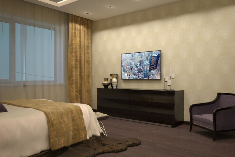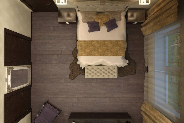 Прошу Вашей помощи, дайте пожалуйста конструктивную критику дизайнерскому решению. Задача сделать спальню в золотых оттенках (или с элементами золота) стиль модерн с элементами ар-деко.