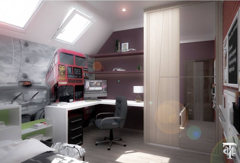 Цветовые решения комнаты в сочных темных тонах уравновешиваются большим светлым потолком с оконным освещением и светлым полом. Такой контраст делает интерьер живым и динамичным, не перегруженным темным цветом. В рабочей зоне использованы фотообои - этот прием позволяет: во-первых - дать фантазию для самовыражения юного заказчика, во-вторых - увеличить пространство комнаты.