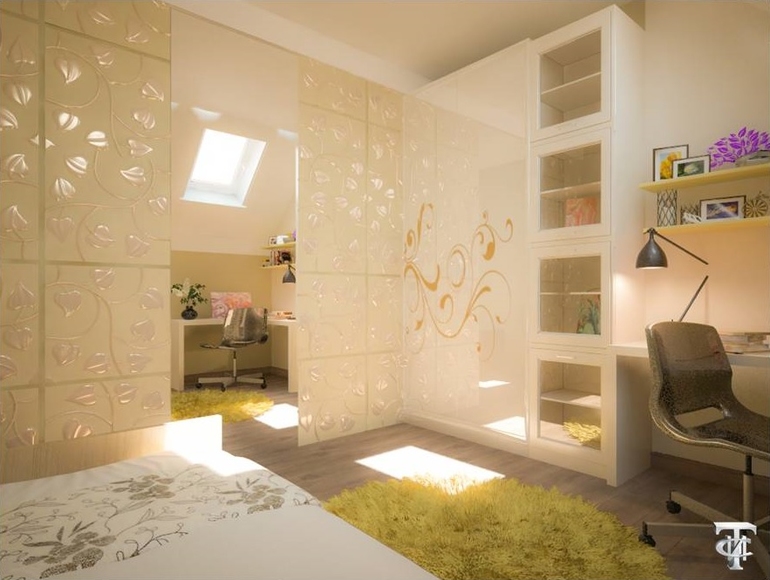 Интересное решение с 3d панелью и встроенным зеркалом, позволило декоративно обыграть свободную от мебели стену и увеличить пространство небольшой комнаты.
