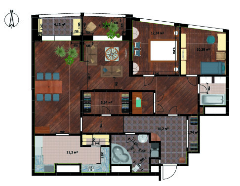 При "прохождении" по квартире я не увидела логики ни в одном уголке. 120м2 и так бездарно ими распорядиться. Смотрите сколько пространства отдано на коридоры. Почему центром не сделать гостиную и вокруг неё выстраивать остальные помещения. Да, в квартире есть огромный минус окна на одну строну, да ещё и северную...