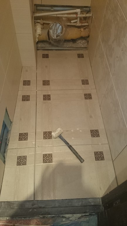 А однотонный кафель на пол как из коллекции мне не хотелось, а этот интересно на мой взгляд выглядит(вставки под цвет двери подошли вообще круто,просто её тут не выложила)