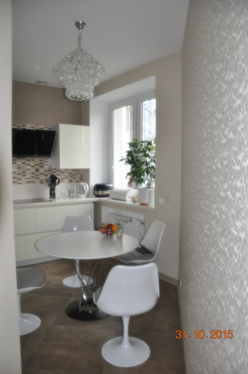 Дизайн-проектом занималась замечательная девушка Светлана, с которой я познакомилась благодаря данному сообществу. Кухня, как видите, у нас очень нестандартной формы, поэтому было не так много вариантов как все разместить. Светлана была привлечена к проекту уже после заказа мной мебели (самой кухни. Столы и стулья выбирала дизайнер), также уже была выбрана и приобретена плитка на фартук и пол. Поэтому у Светланы были определенные ограничения, пришлось работать с рядом готовых решений, на мой взгляд она справилась безупречно, дизайн-проект кухни был утвержден с первого раза.