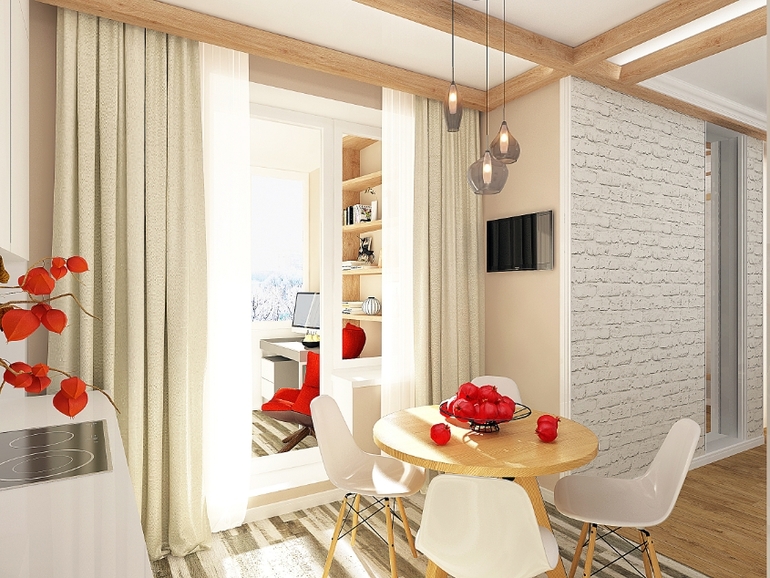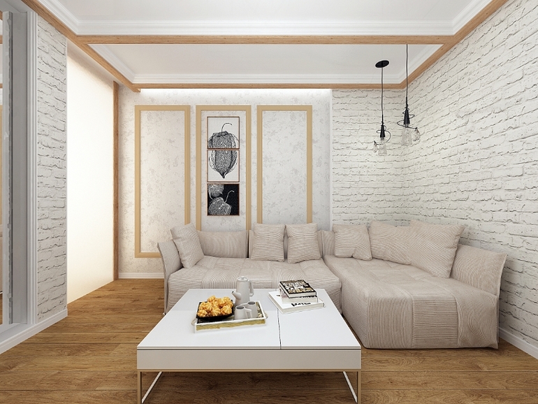 Студийная планировка - наиболее подходящий вариант для современного человека, стремящегося к простору. Чтобы усилить впечатление единого объёма, были визуально "стёрты" явные границы между зонами. Гостиная является проходной комнатой для двух помещений - спальни и кухни. Домочадцы, находящиеся в кухне, могут общаться с теми, кто расположился в гостиной, параметры внушительного проема обеспечивают такую возможность.