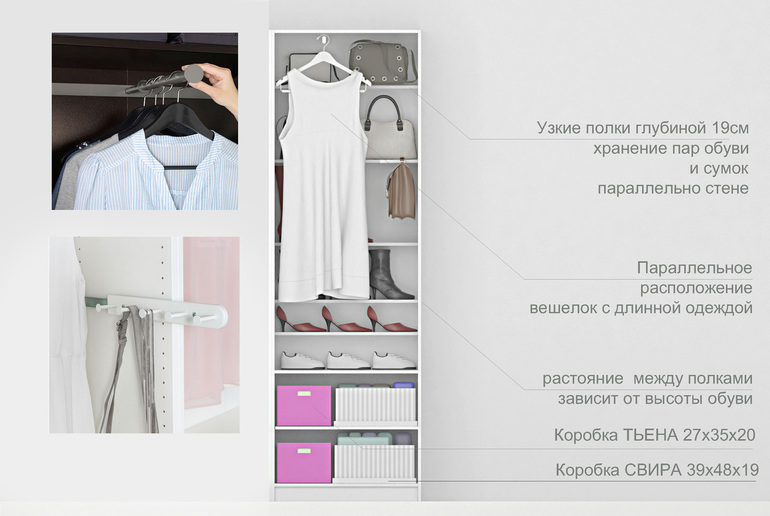 У гардероба ПАКС ширина отсека - 72.3 см, подойдет комбинация коробок шириной 27см (ТЬЕНА) и 39 см(СВИРА). Высота полок на 10см больше высоты коробок - для возможности обзора содержимого.