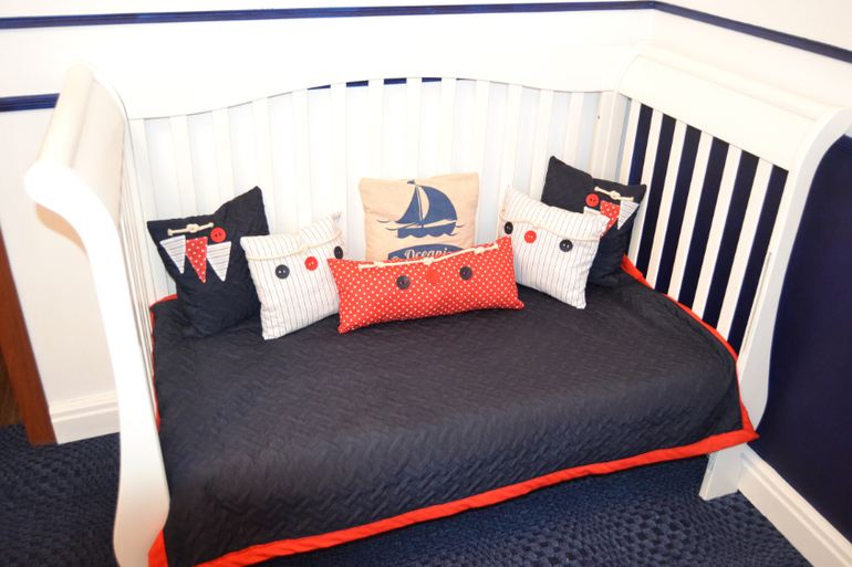Много элементов подсмотрела на просторах Бебиблога Деревянный ящик для книг у Наталья муж сделал сам,я покрасила. Много картинок и идей в посте подборке у Евгения , флажки скачала с интернета ( уже не помню где) , вёсла на стену уж очень хотела с Алиэкспресс заказать, но пока думала дорогие они там стали, сделали сами. Заказала только рыбок, наклейку маяк и деревянный морской декор. Нашила подушечек в кроватку и заменили белый пушистый ковролин на более практичный для мальчишеских игр. Вот и все, сильно усложнять комнату не стали, хотя еще лежит гамак и карты морские. Будем дополнять и пополнять.