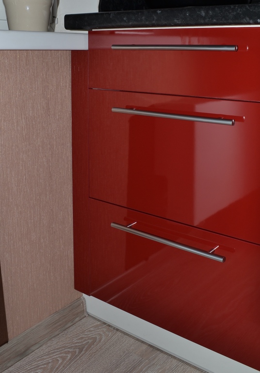 Фасады из пластика (низ - глянец, цвет «спелая вишня», верх - матовый с глянцевым узором, цвет «молочная ваниль»