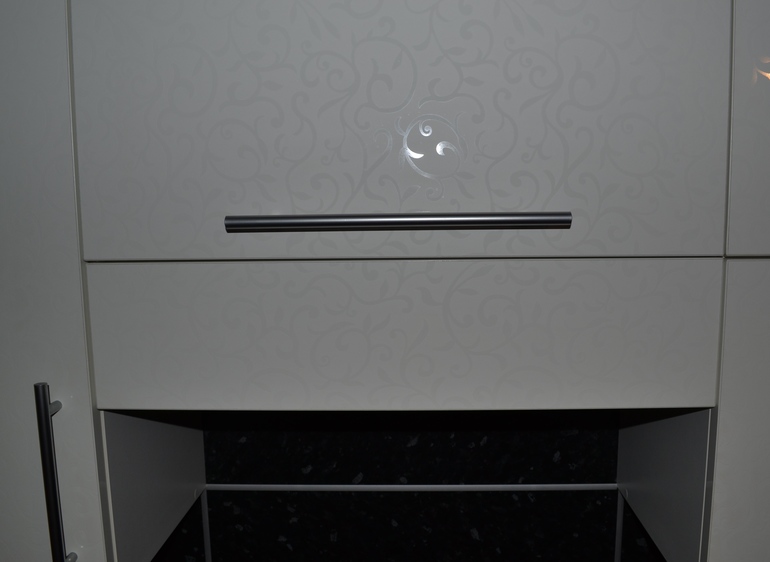 Над фасадом, который находится над варочной поверхностью, сделали фальш-панель, туда будет встраиваться вытяжка, она как раз и по высоте будет оптимальной, и места в верхнем модуле не будет «съедать»