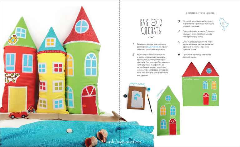 Очень, очень мне понравилось шить интерьерные подушки в виде домиков! Если сшить много, в детской можно сделать свой маленький город из таких домиков-подушек. А еще их же можно очень интересно декорировать: сделать открывающиеся ставни, пришить трубу, пустить плющ по стенке домика. В общем, ту фантазия просто безгранична! Я даже подумывала нашить таких домиков и продавать в "Стране мастеров" :)