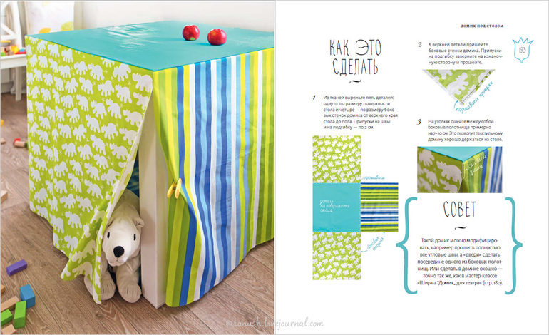 А "Домик под столом" - это из серии "проще не бывает". Фактически - это отрезы тканей, закрепленные по углам стола небольшими строчками. 5 минут и домик готов!"