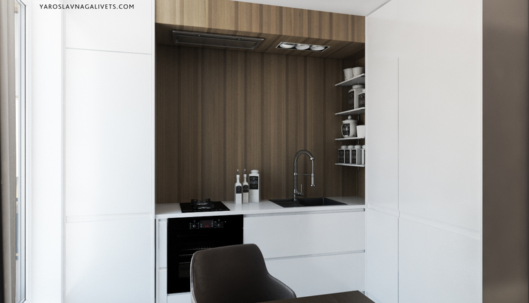 Я там свою кухню показывала белую. По мне очень удобно. посуда в нижнем выдвижном ящике. Мы делали акцент на фартуке. Выкладывали его до потолка.