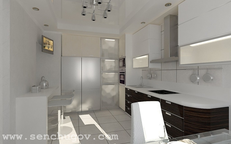 В фасаде кухни использовано дерево венге. Встроенный холодильник сливается с кухонной мебелью в одну плоскость. Кроме стола на кухне есть еще белая барная стойка вдоль стены.