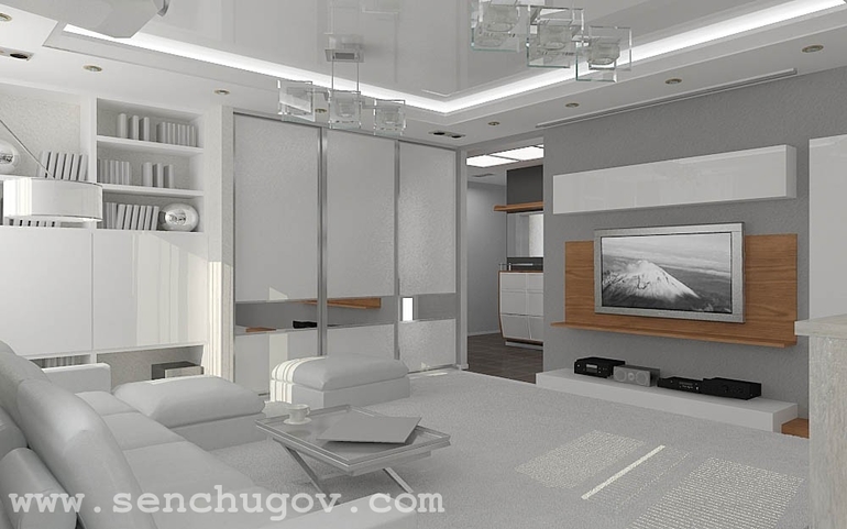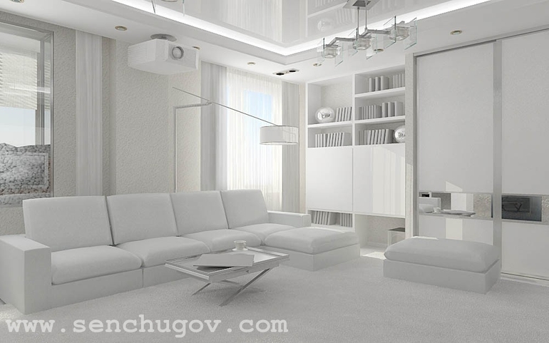 Авторские проекты дизайнеров.(Посты не по теме будут удаляться!)Квартира для молодой семьи: родители и их ребенок. Проект дизайна квартиры решен в минимализме. Гостиная практически белая. Паркет, глянцевый потолок, корпусная мебель, кожаный диван: при отделке квартиры максимально использованы оттенки белого.