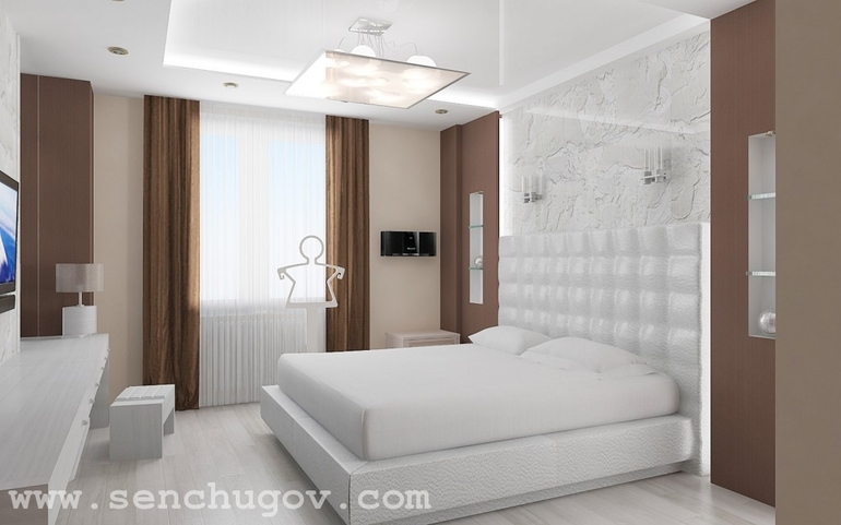 В соответствии с проектом интерьера спальня также выполнена в светлых тонах, оттенках кремового и коричневого.