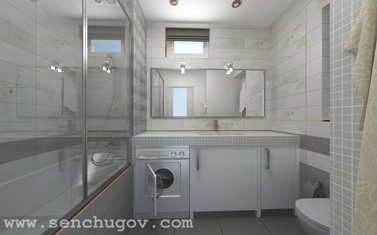 Ванная с душем по проекту интерьера отделена от остального пространства стеклянной перегородкой и стенкой из стеклоблоков. Стиральная машина вмонтирована под столешницу раковины. Окно в ванной уменьшено сверху, что дало возможность разместить на стене большое зеркало.