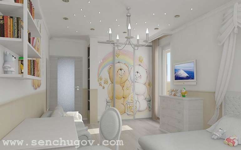 В детской на встроенном шкафу изображен медвежонок. Мебель классическая, а на потолке сделано звёздное небо из светодиодов.