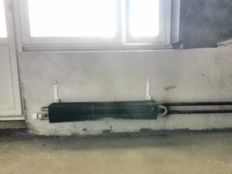 Рассмотрим стандартные батареи отопления от застройщика… Это просто изгиб стальной трубы с приваренными на нее стальными пластинами.