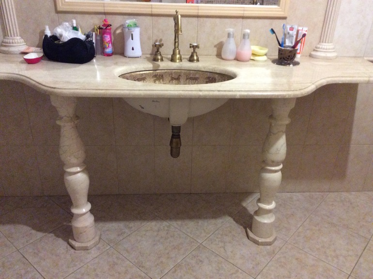 4. Стол. Как видите он большой, но бестолковый получился и как бы не законченный на мой взгляд. Хотя изначально я не хотела глухой а именно на ножках хотелось. Но теперь мне не нравится вид раковины под столешницей. Может какую красивую тумбу под него можно заказать ( слоновая кость с лёгким патинированием) ? Или как раз можно как то длинные держатели металлические ( латунь, ковка) для полотенец расположить? Голову сломала. Уже.
